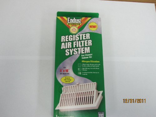 Fits 4 x 10 Air registers. Exclusive filter change indicator. More. Add to list. Price Alert. ... $5.89 Endust Register Air Filter System 4 x 10 + $5.99 shipping